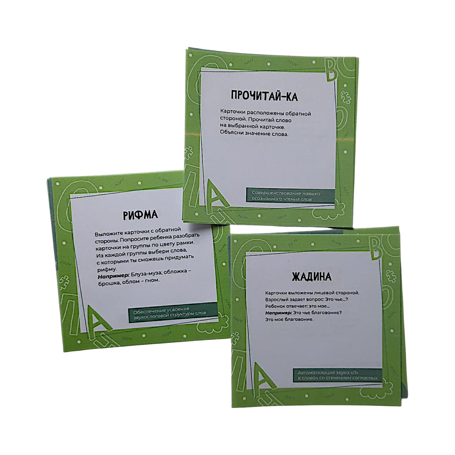 В наборе 21 двухсторонних карточек на звук Л. Размер карточек 9/9см.