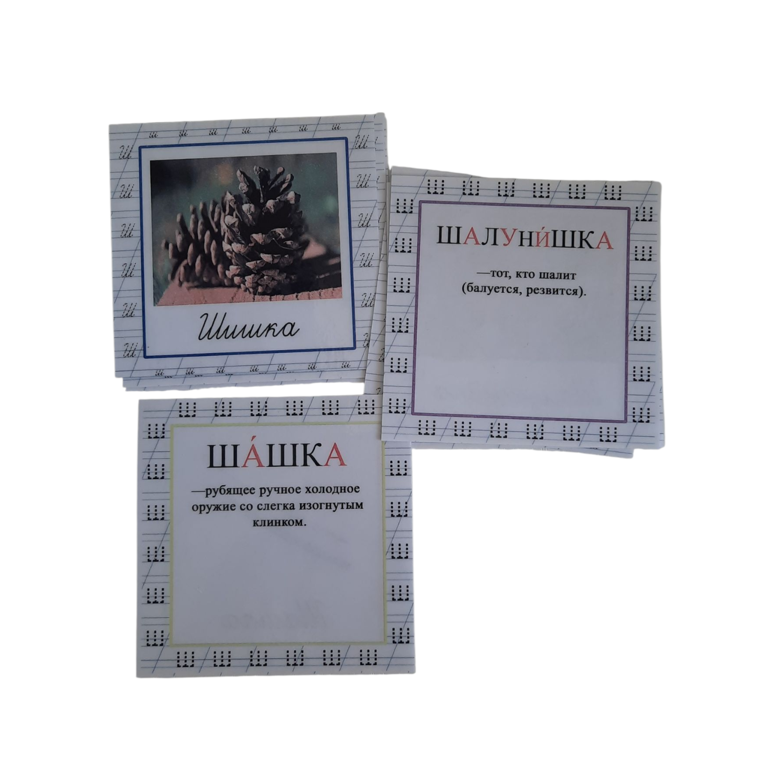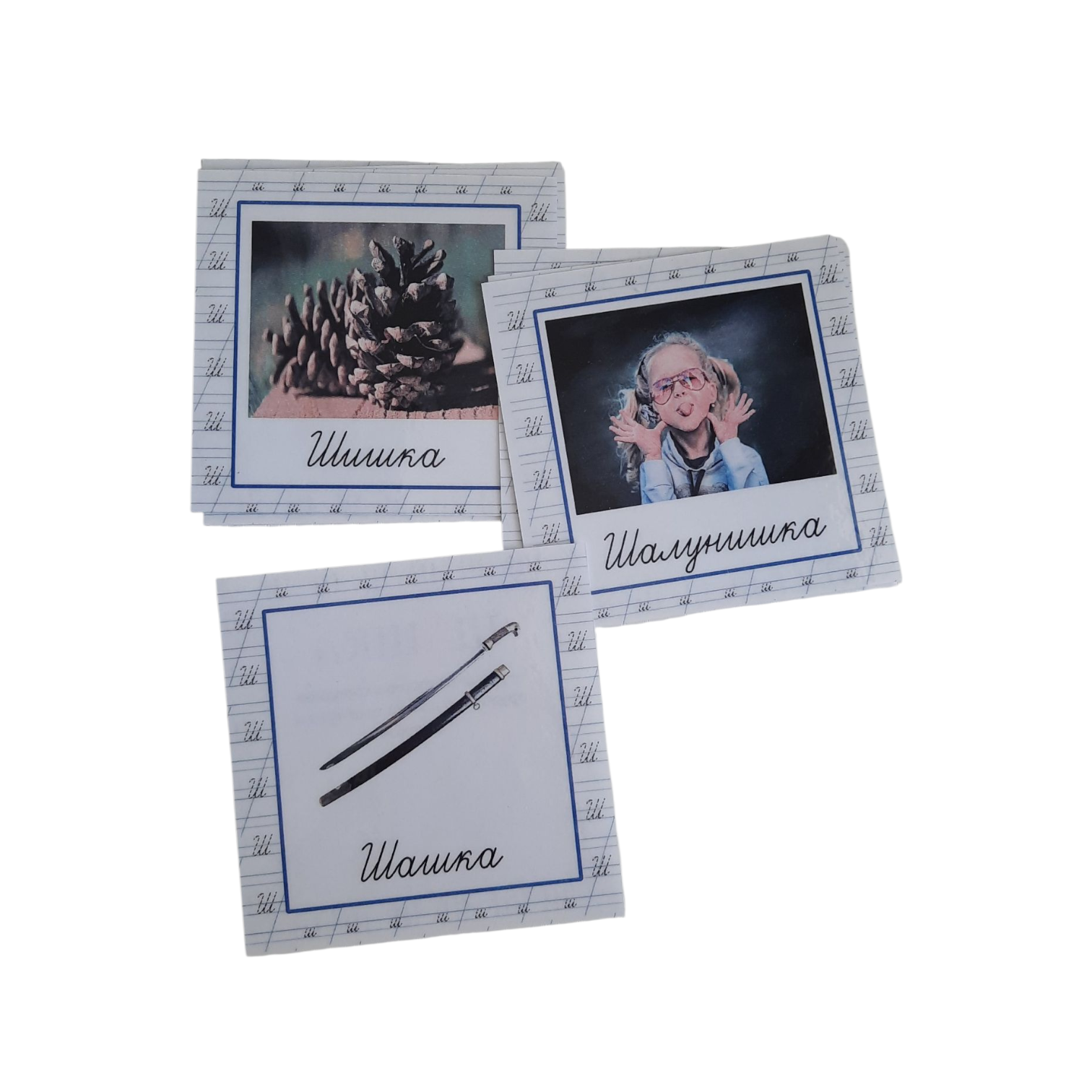 В наборе 18 двухсторонних карточек на звук Ш. Размер карточек 9/9см.